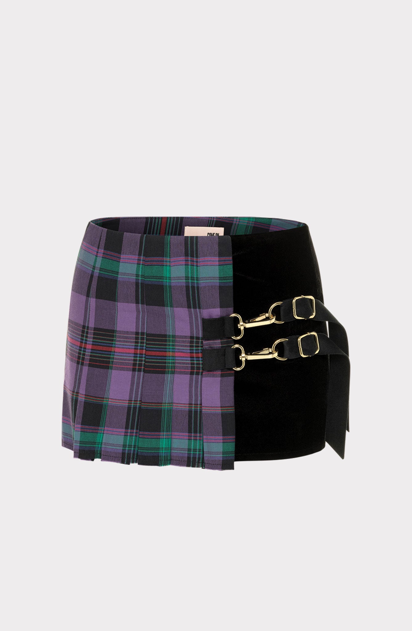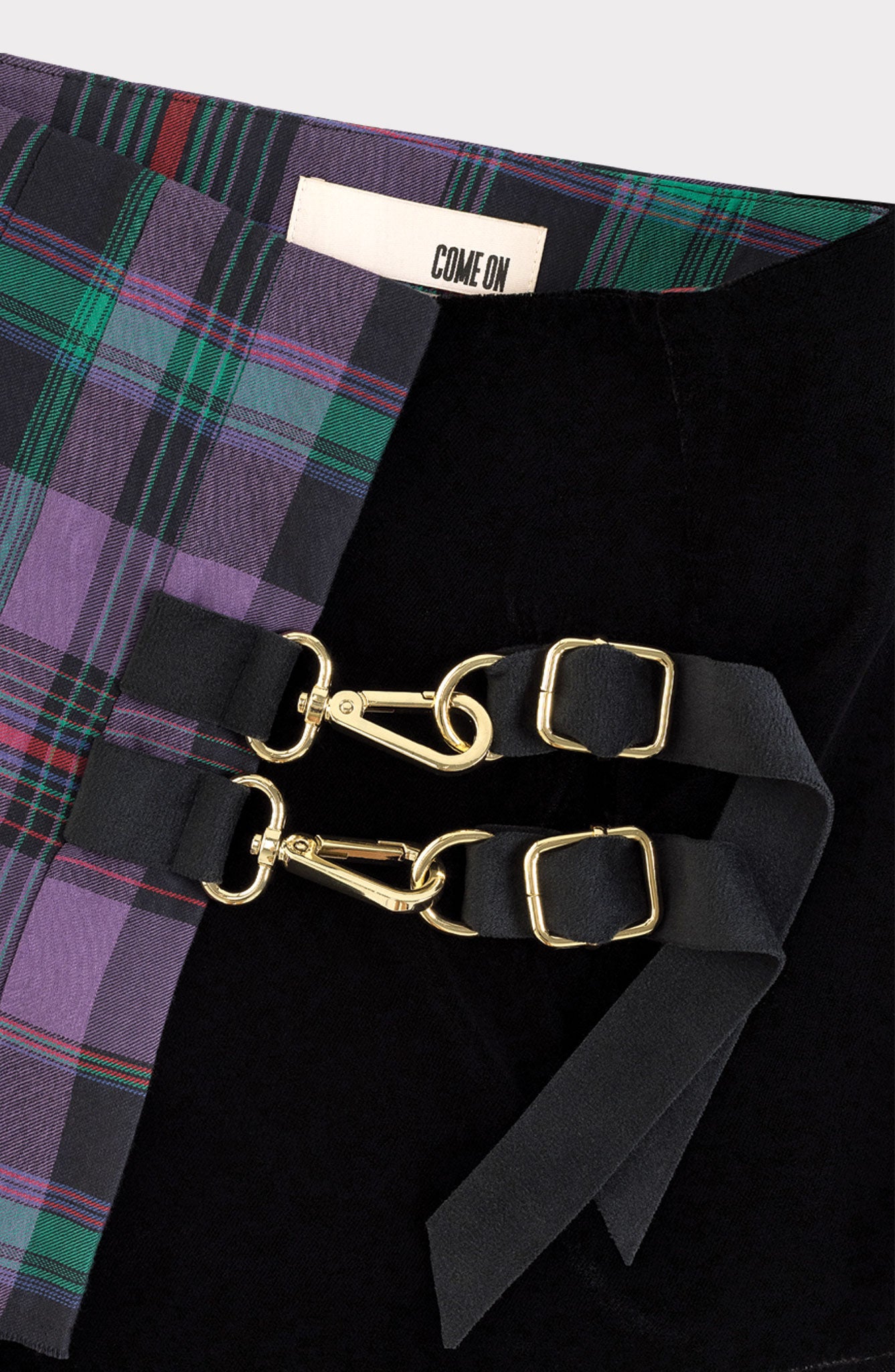 The Jack mini skirt covers just enough with a playful combination of tartan and velvet fabrics. This design is a cut version of our Jack skirt, speaking to the circular fashion spirit of our Come On Tear Me Apart collection, and inviting customers to interact with the designs. The side gold buckles add a classy touch, while the mini length offers a punk(ier) twist on traditional tartan. Versatile and bold, this skirt is perfect for making a statement wherever you go. Wear our tartan mini skirt with our Come On t-shirts, shirts, and jackets.