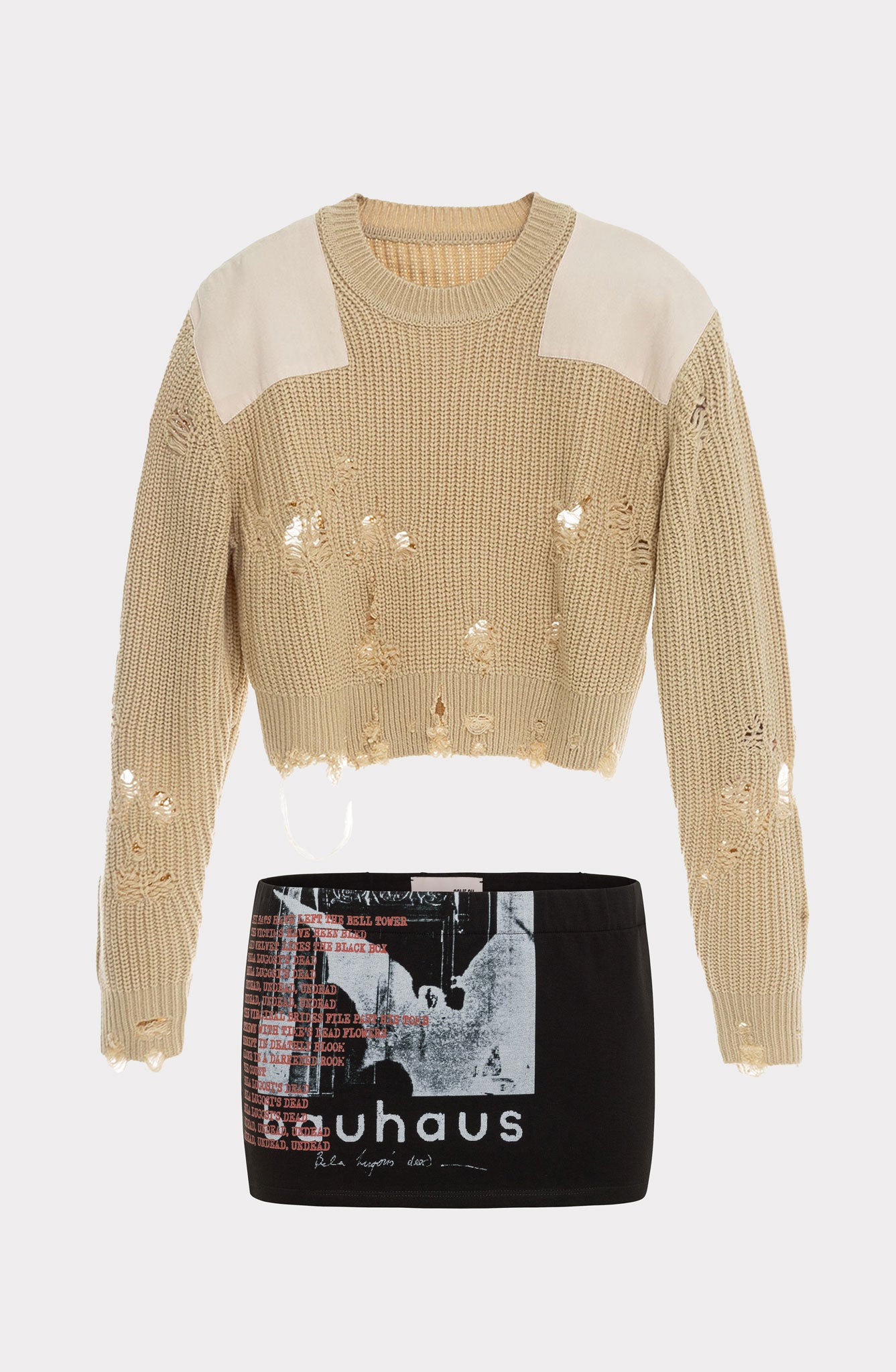 The Bauhaus mini skirt is both revealing and comfortable, making it a versatile staple with personality. It features the cover image of the British band classic single "Bela Lugosi's Dead". Where these two pieces together to slay the night.