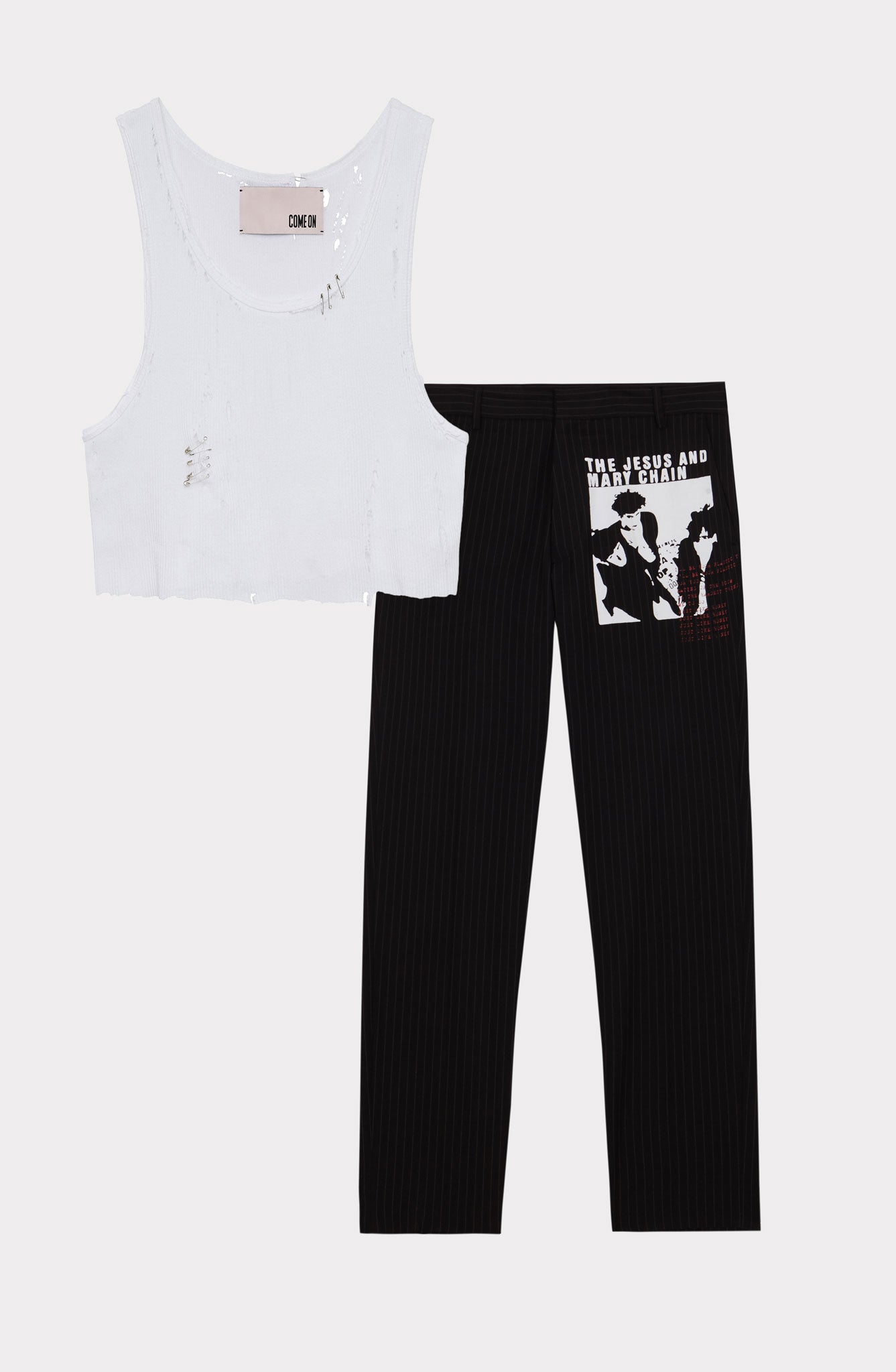 The Jesus trouser blends a classic tailored style with a front print featuring the iconic Scottish alt-rock band The Jesus and Mary Chain.