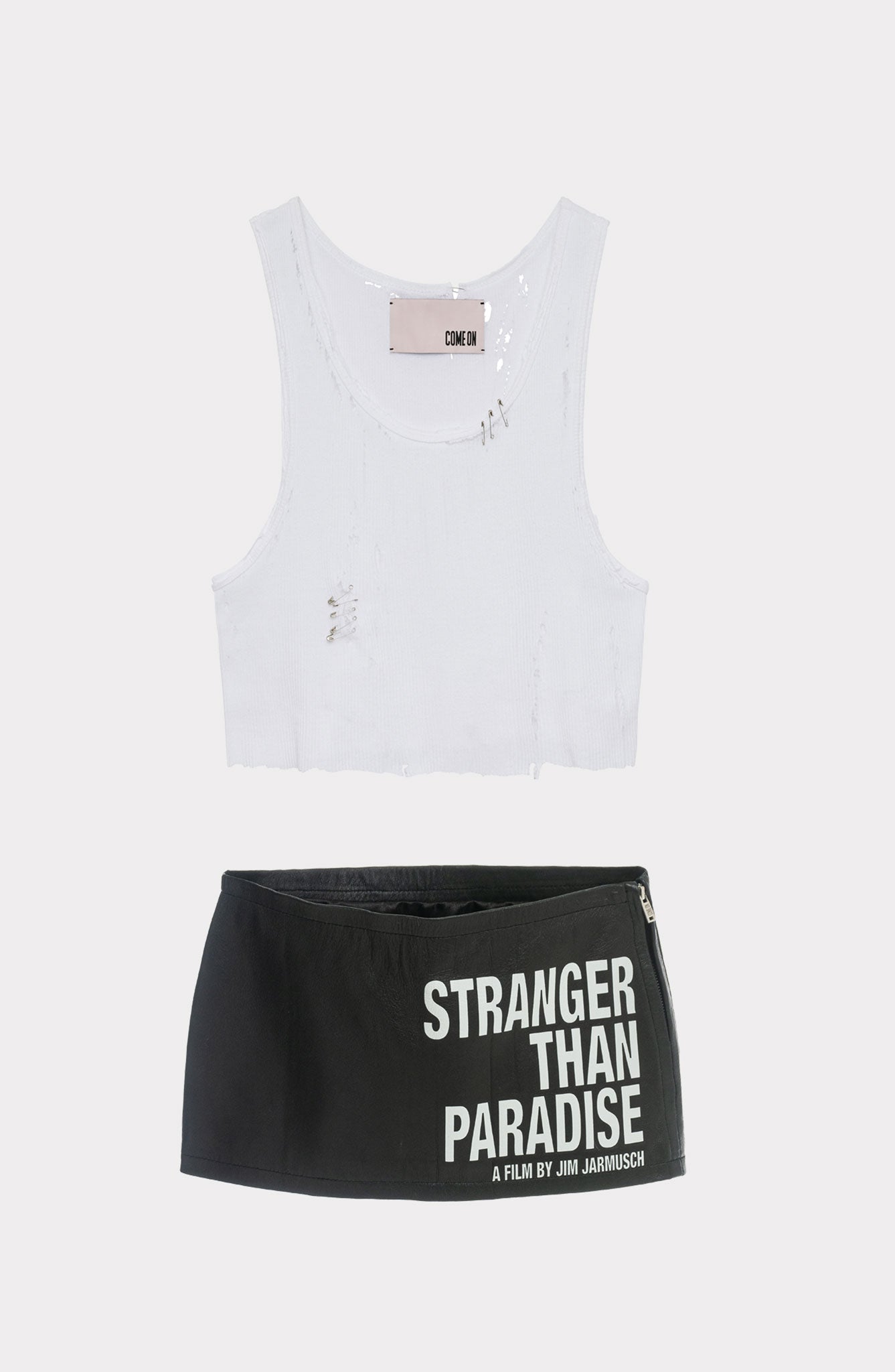 The Hell T-shirt, a white ribbed cotton tank top, exudes an edgy vibe with its distressed look and silver safety pins. This versatile, unisex shirt is both lightweight and soft, making it perfect for pairing with our Stranger Leather Mini Skirt: 100% leather with front print and side metal zipper. Slim, body-hugging silhouette for a structured fit
