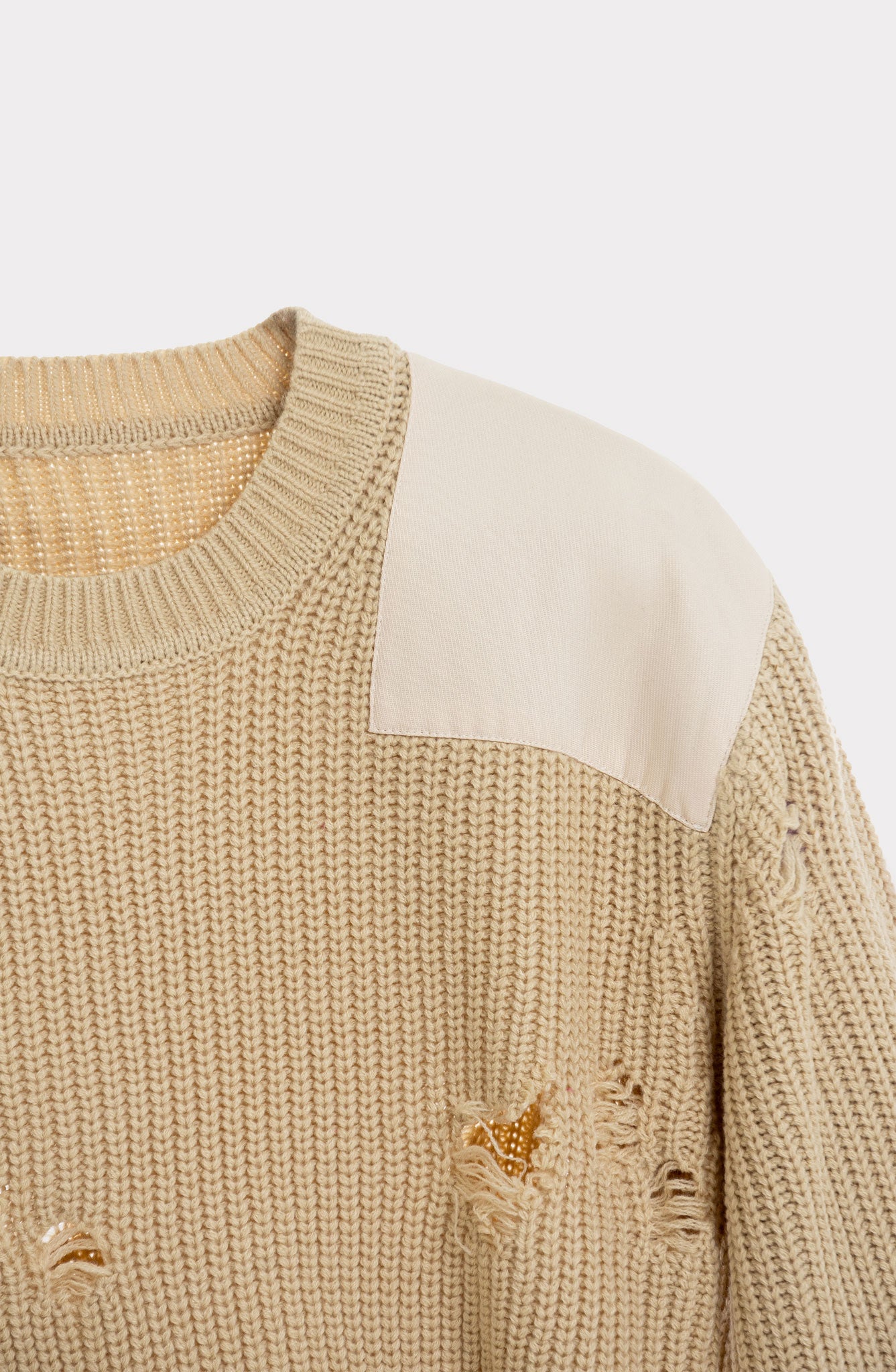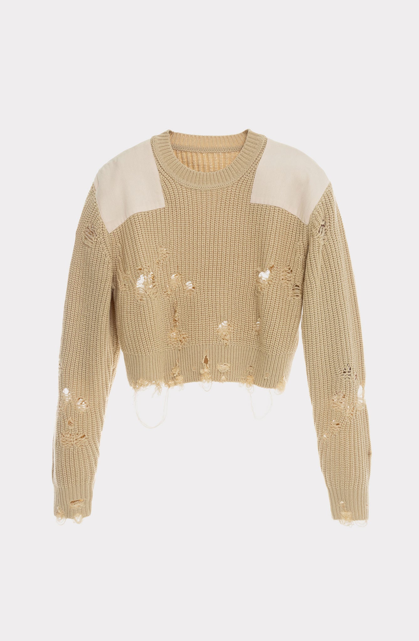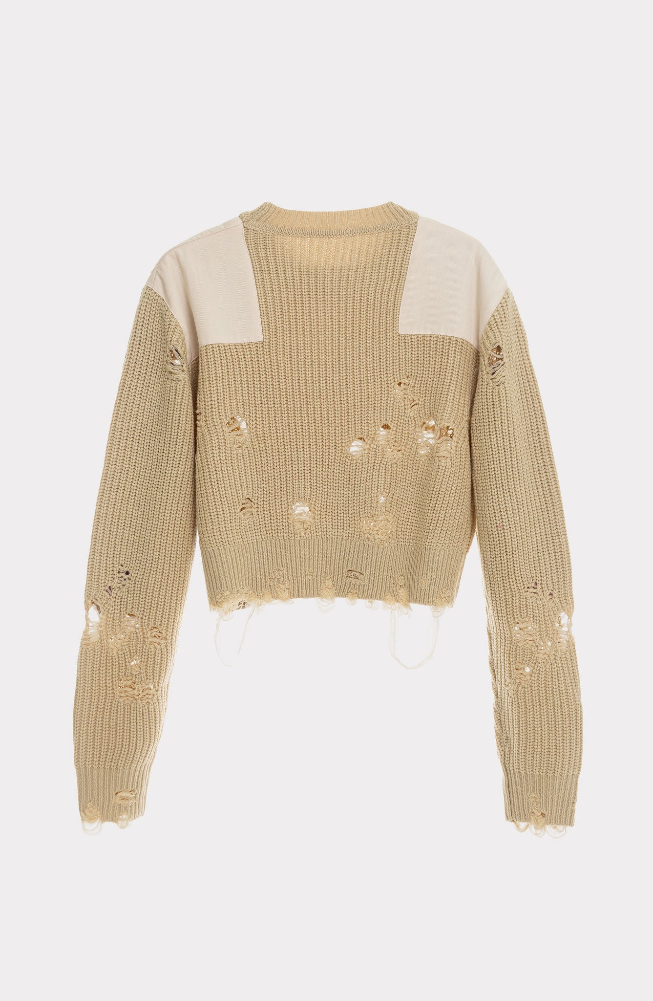 Slim fit sweater with tonal shoulder patches and distressed details on front, back, and sleeves. Modular waist-length design for versatile fit.The design is inspired by classic military sweaters, reinterpreted with a contemporary, genderless approach.