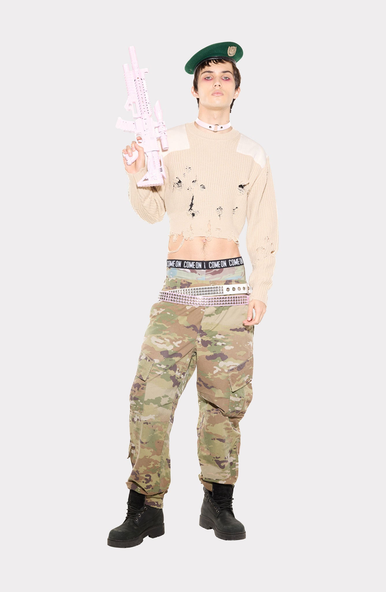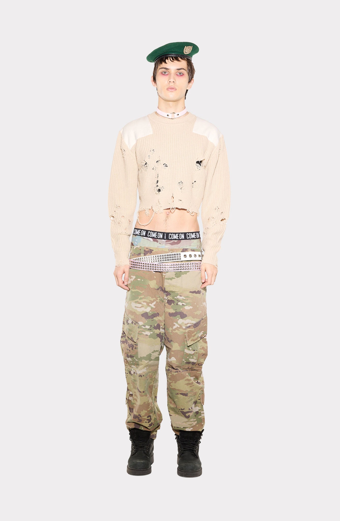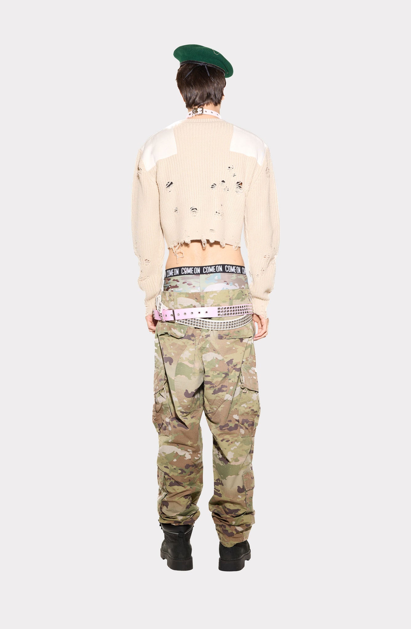 Slim fit sweater with tonal shoulder patches and distressed details on front, back, and sleeves. Modular waist-length design for versatile fit.The design is inspired by classic military sweaters, reinterpreted with a contemporary, genderless approach.