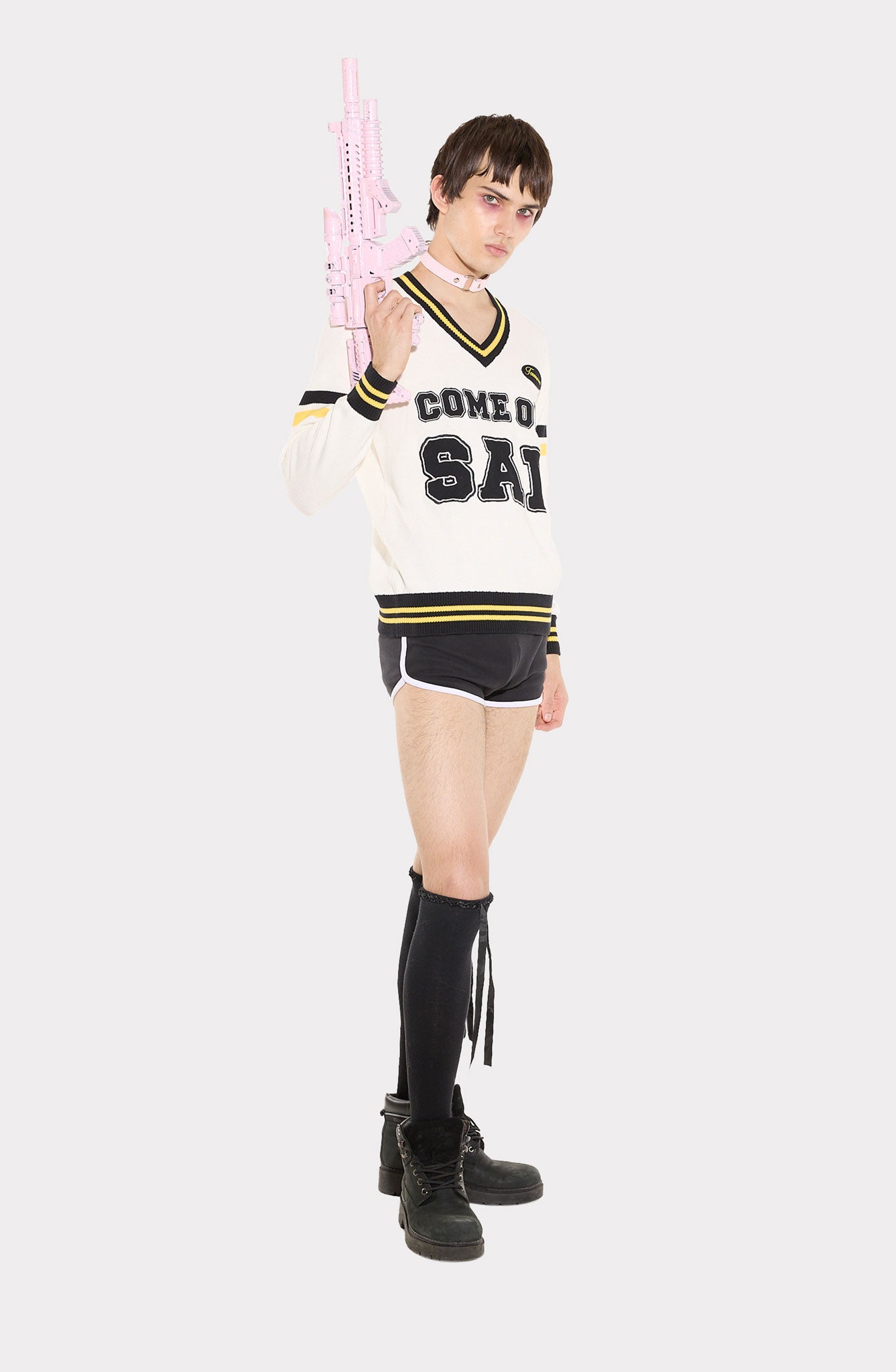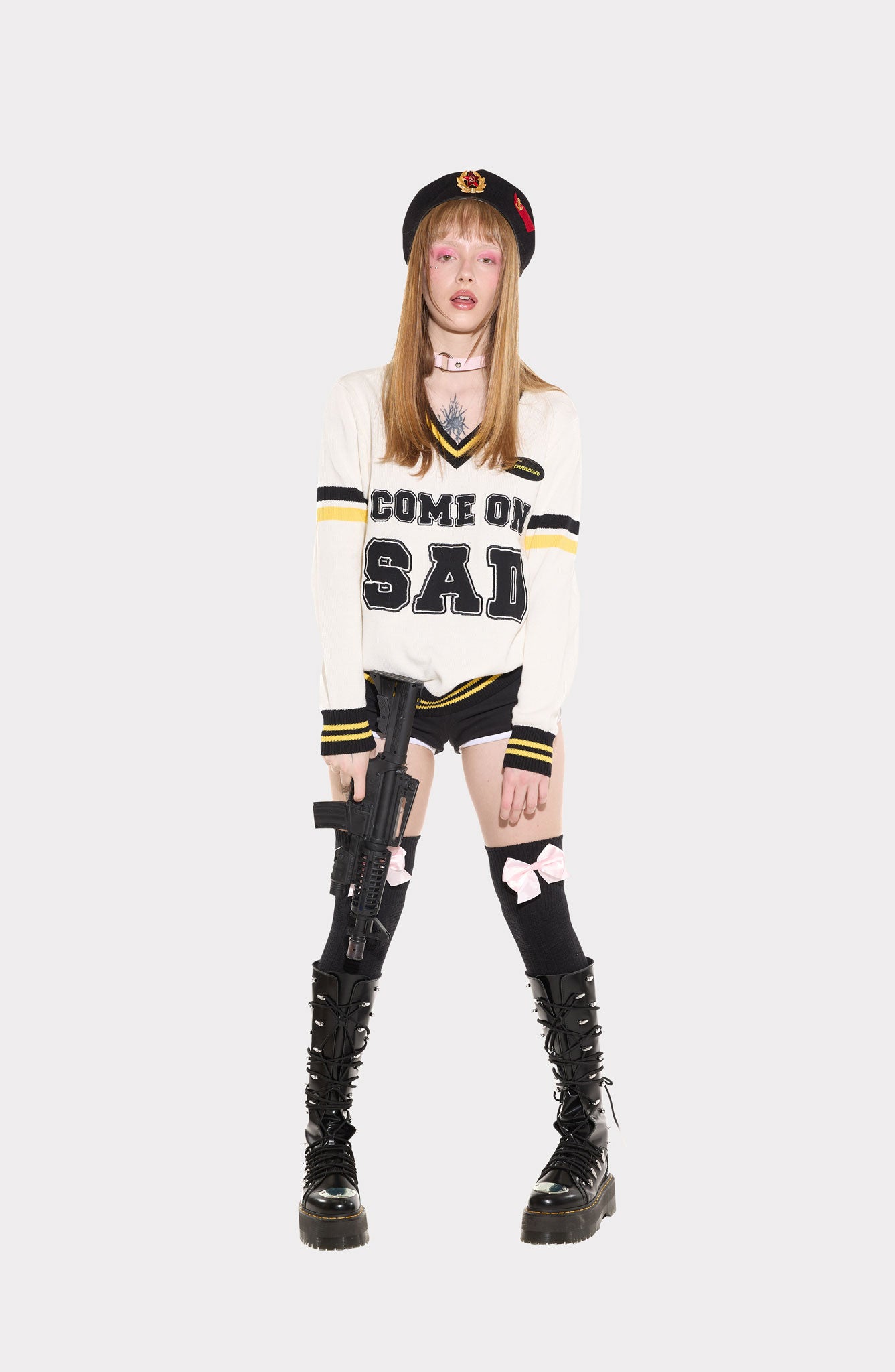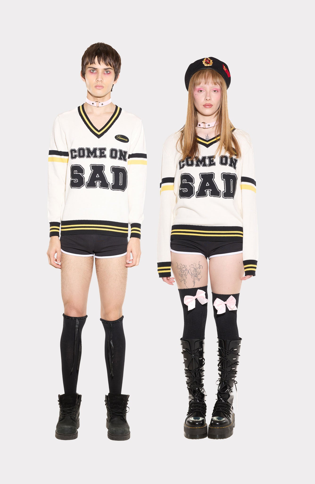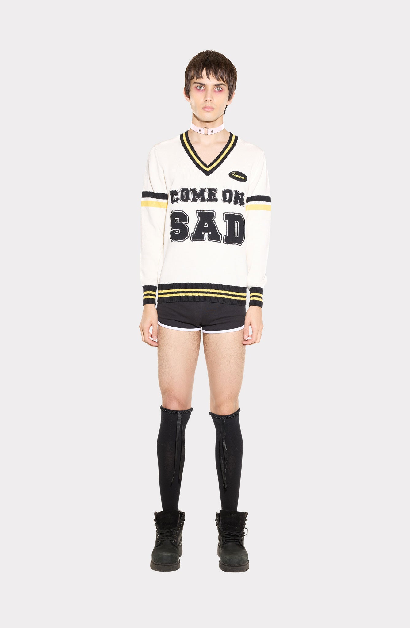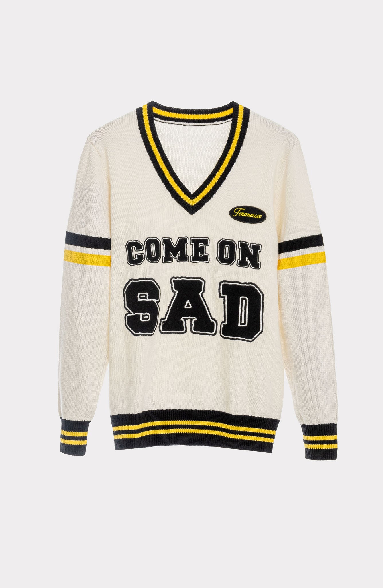 Genderless regular fit sweater with brand embroidery, ‘SAD’ and tennesse patch on the chest. V-neck with color-contrasted trim, knitted fabric, and matching cuffs and waistband. The design takes inspiration from classic varsity cheerleader uniforms, reinterpreted with a contemporary, genderless approach.