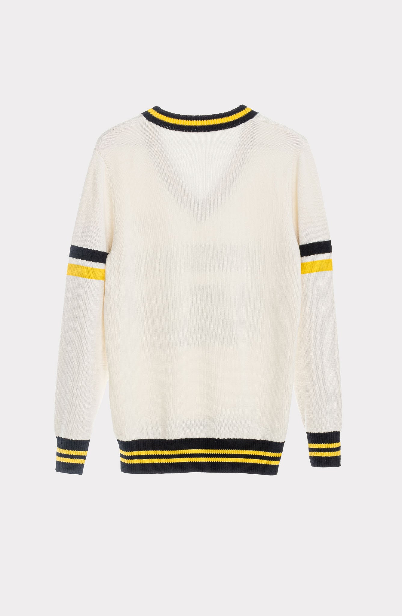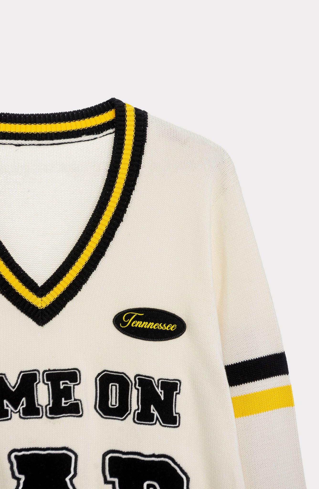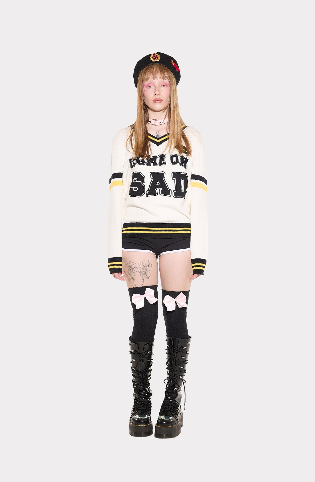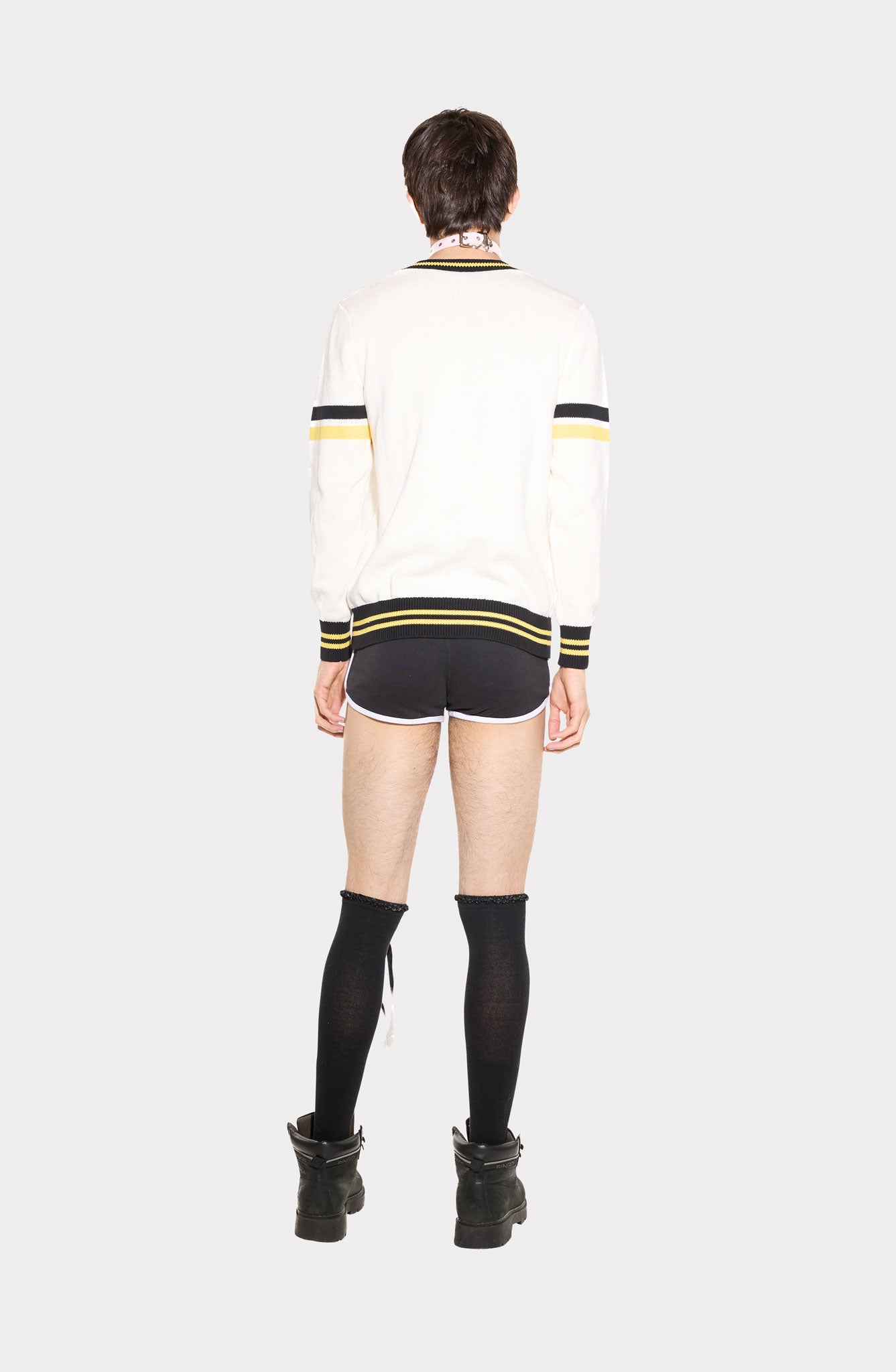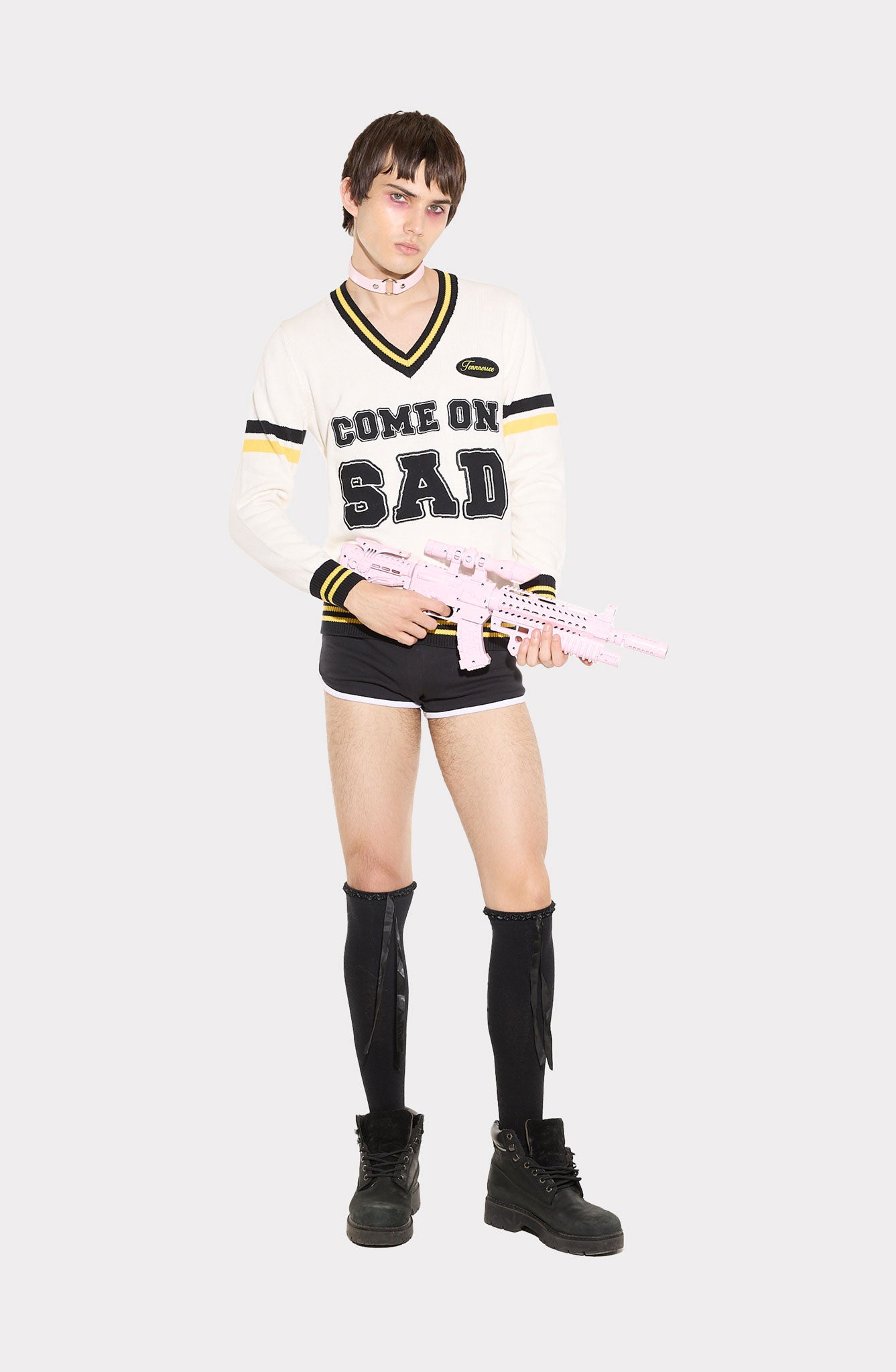 Genderless regular fit sweater with brand embroidery, ‘SAD’ and tennesse patch on the chest. V-neck with color-contrasted trim, knitted fabric, and matching cuffs and waistband. The design takes inspiration from classic varsity cheerleader uniforms, reinterpreted with a contemporary, genderless approach.