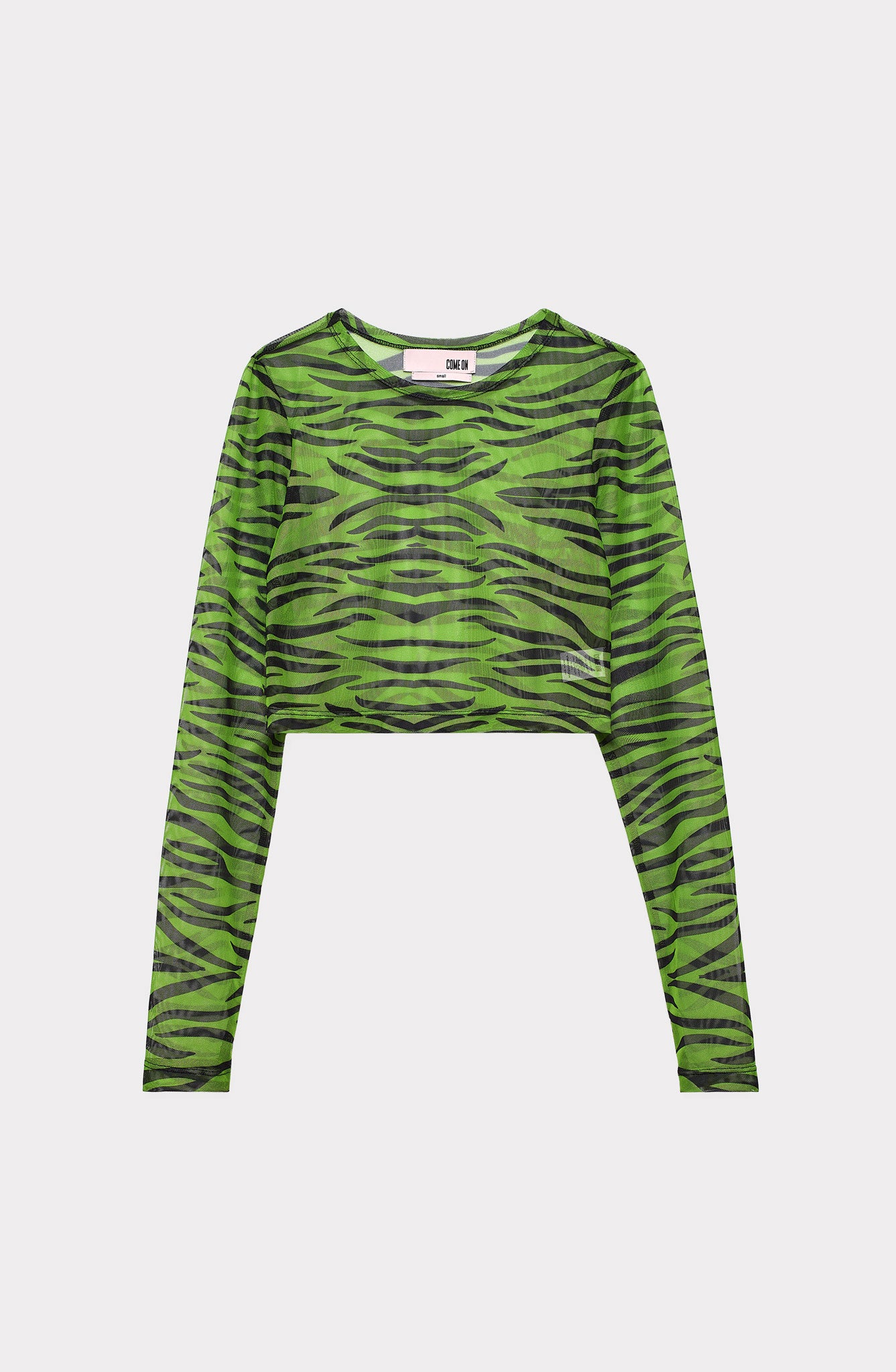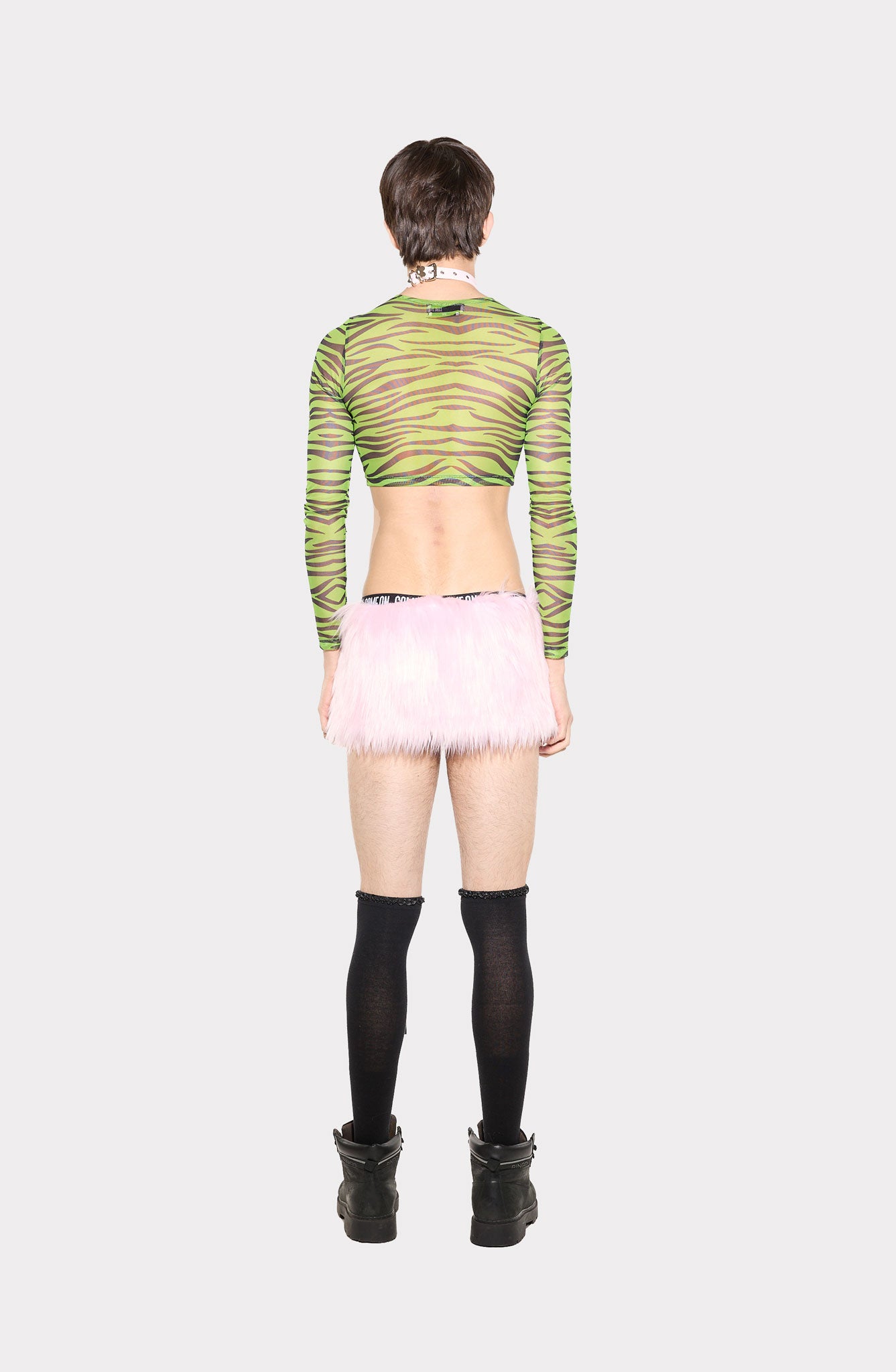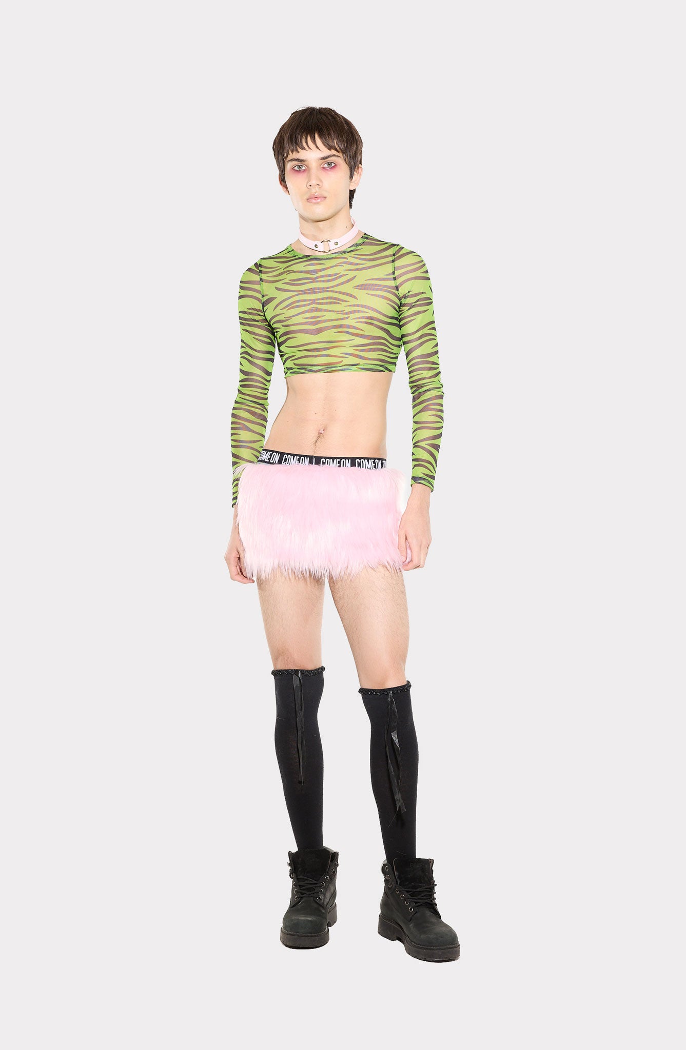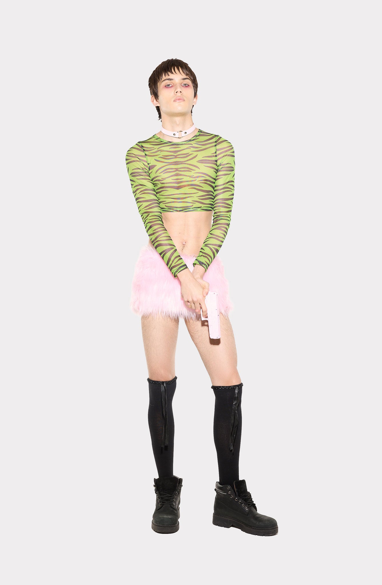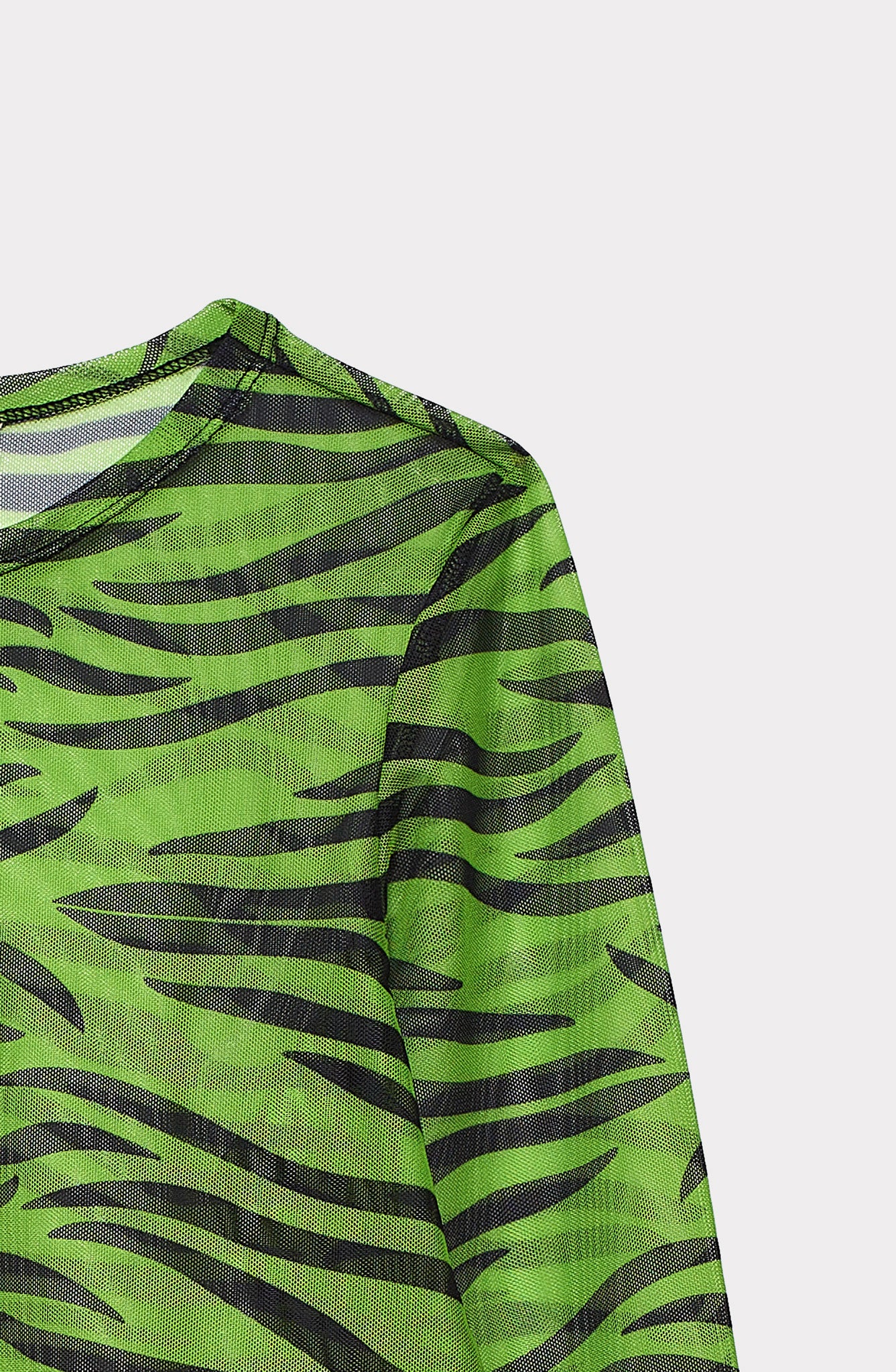 This animal print micro tulle long sleeve t-shirt, is inspired in pop and hyperpop culture. It has a vibrant green color and zebra pattern. See through and cropped, it can be matched with one of our mini skirts for a recklessly hot look.