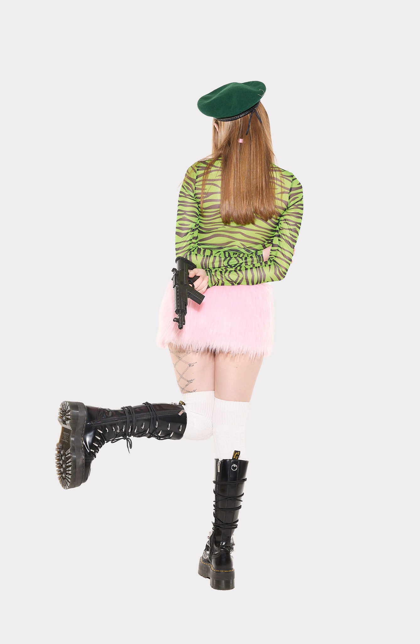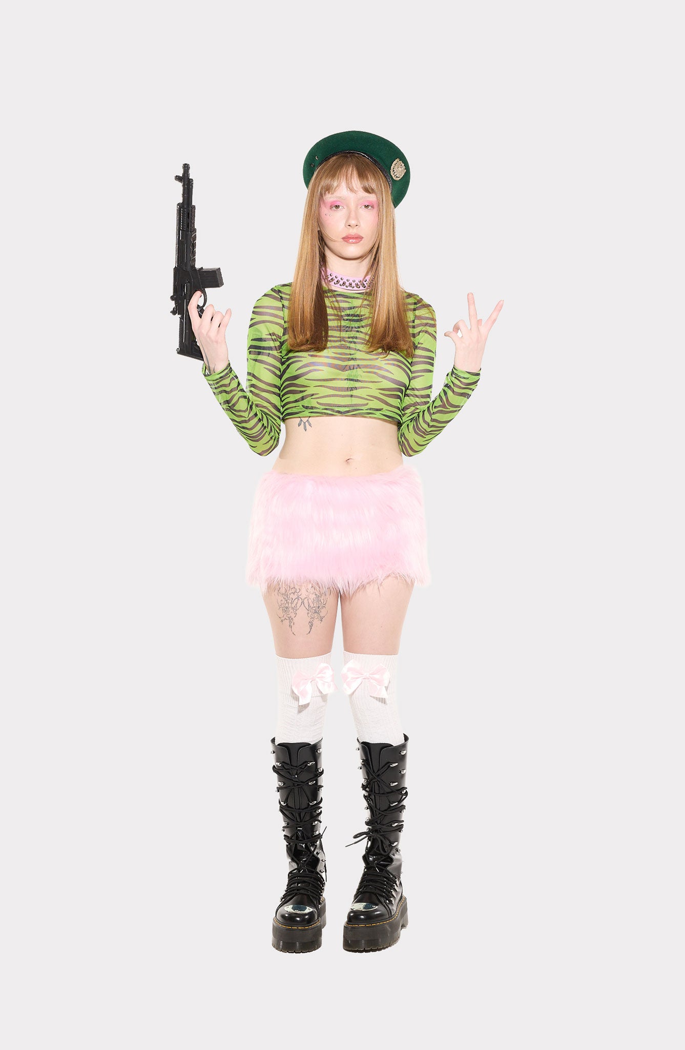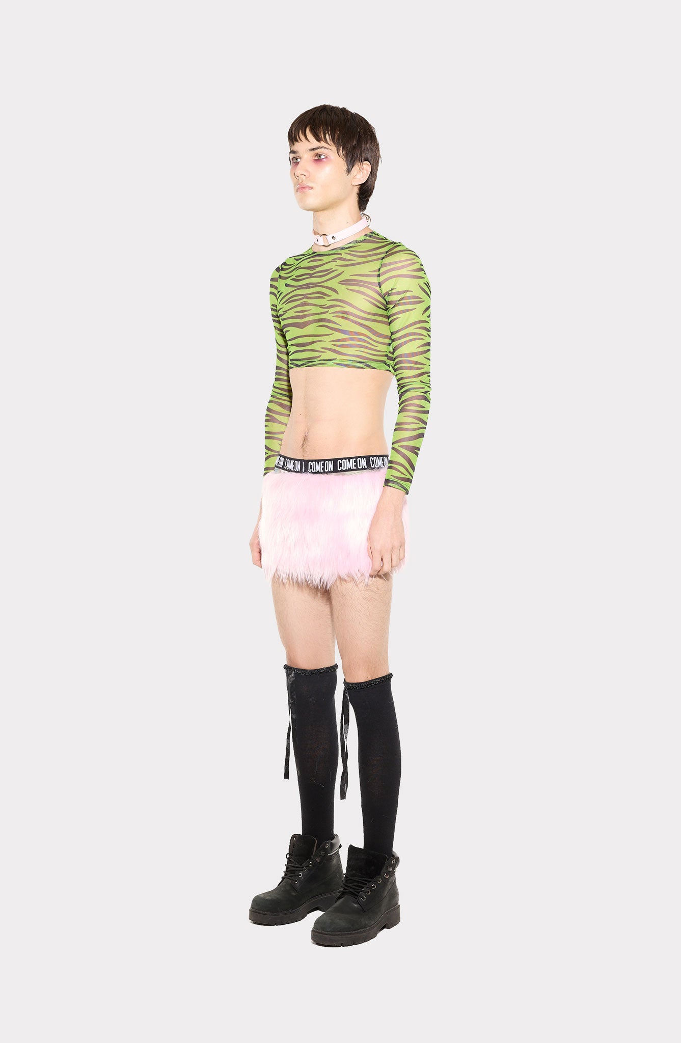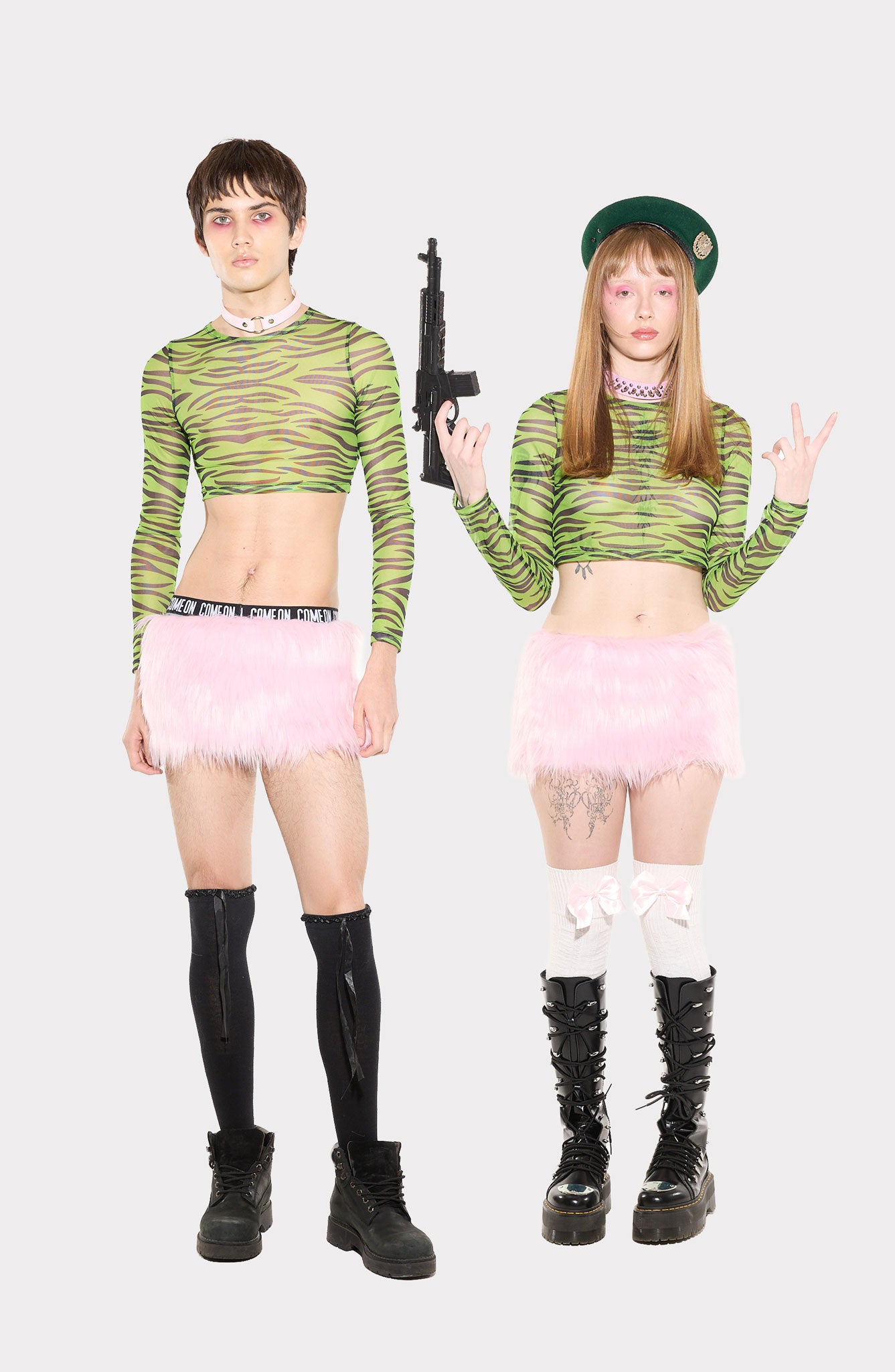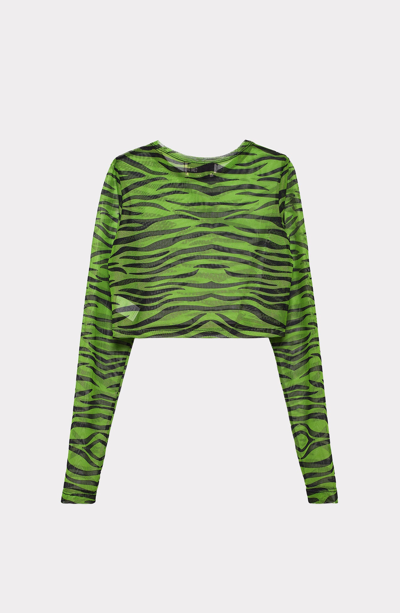 This animal print micro tulle long sleeve t-shirt, is inspired in pop and hyperpop culture. It has a vibrant green color and zebra pattern. See through and cropped, it can be matched with one of our mini skirts for a recklessly hot look.